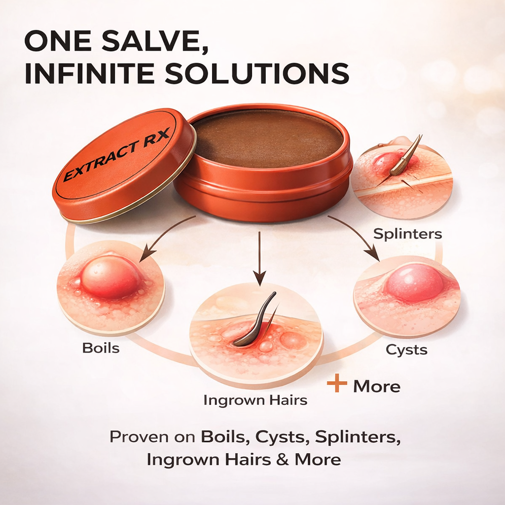Extract RX is a clinically-powered drawing salve that harnesses natural active ingredients to pull infections, cysts, and embedded irritants to the surface—faster than traditional remedies. Unlike the homeopathic formulas of the past 50 years, Extract RX delivers visible results in hours, not days. One customer with a severe groin boil that left her barely able to walk experienced complete drainage within 2-3 hours of application. Another finally freed herself from a stubborn 3-year cyst with a single overnight treatment.